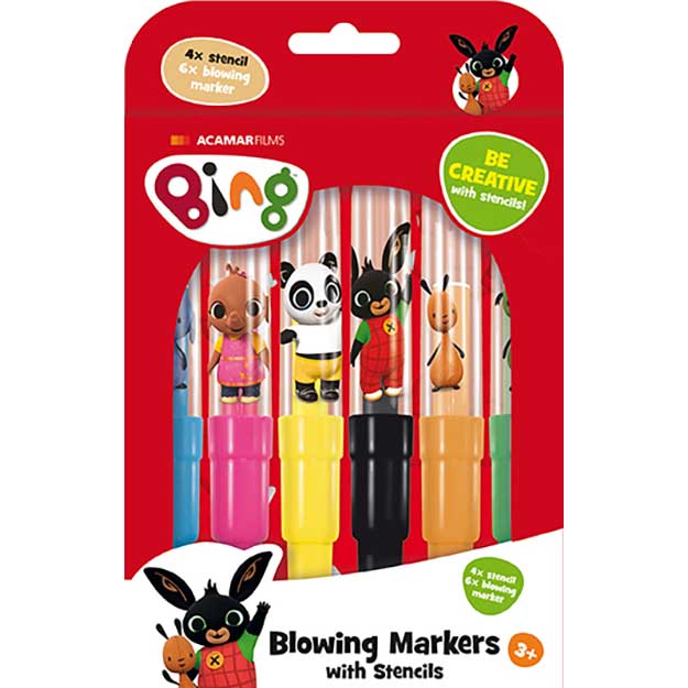 Balenie obsahuje 6 farebných fúkacích fixiek s potlačou a 4 farebné papierové šablónky v obľúbených rozprávkových motívoch.