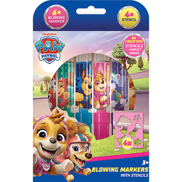 Balenie obsahuje 6 farebných fúkacích fixiek s potlačou a 4 farebné papierové šablónky v obľúbených rozprávkových motívoch.