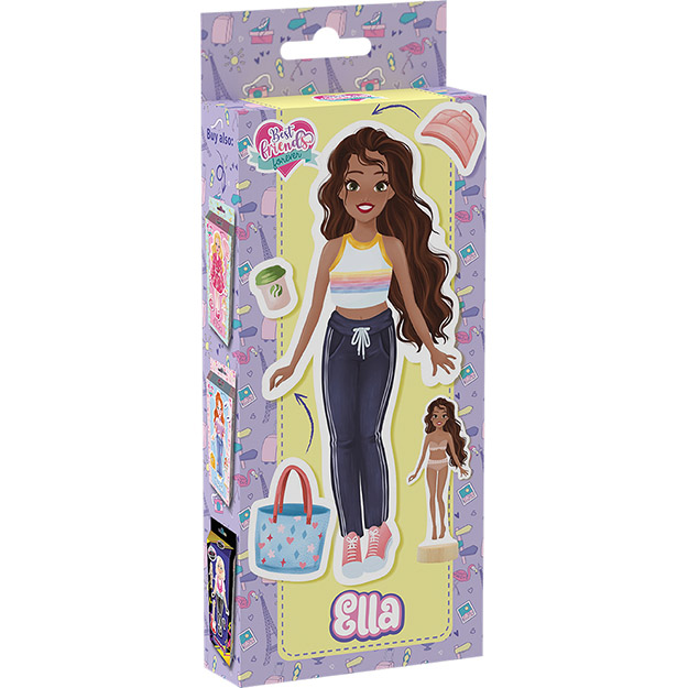 Balenie obsahuje obliekaciu postavičku, 3 hárky magnetických častí oblečenia, topánok a doplnkov a drevený podstavec.